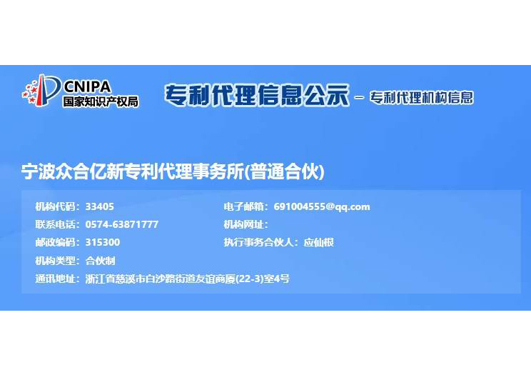 浙江億新知識產(chǎn)權(quán)服務(wù)有限公司前身為慈溪眾合知識產(chǎn)權(quán)代理事務(wù)所,創(chuàng)始于2004年,為了服務(wù)更多的創(chuàng)新企業(yè),實現(xiàn)“服務(wù)億萬創(chuàng)新企業(yè)”的理念,后更名為浙江億新知識產(chǎn)權(quán),旗下公司包括:寧波眾合億新專利代理事務(wù)所(機(jī)構(gòu)代碼33405)、中范(北京)認(rèn)證有限公司。其中寧波眾合億新專利代理事務(wù)所是慈溪市科技服務(wù)聯(lián)盟理事單位,前灣區(qū)知識產(chǎn)權(quán)工作站。公司位于浙江省慈溪市文化商務(wù)區(qū)友誼商廈,并在北京、青島設(shè)有辦事處。